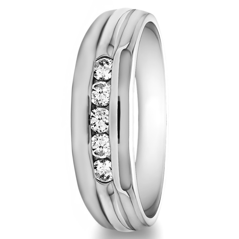 This men's ring features 5 white round channel set stones. The band measures 5.5mm in total width. The total combined carat weight is 0.5 carats. This listing features moissanite, cubic zirconia or natural diamonds. This men's ring weighs 14.67 grams and features a comfort fit band. This ring has a raised center with flat high polished edges.