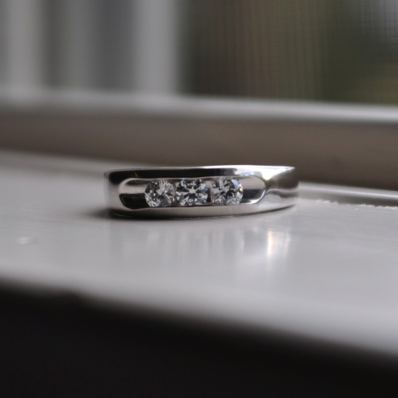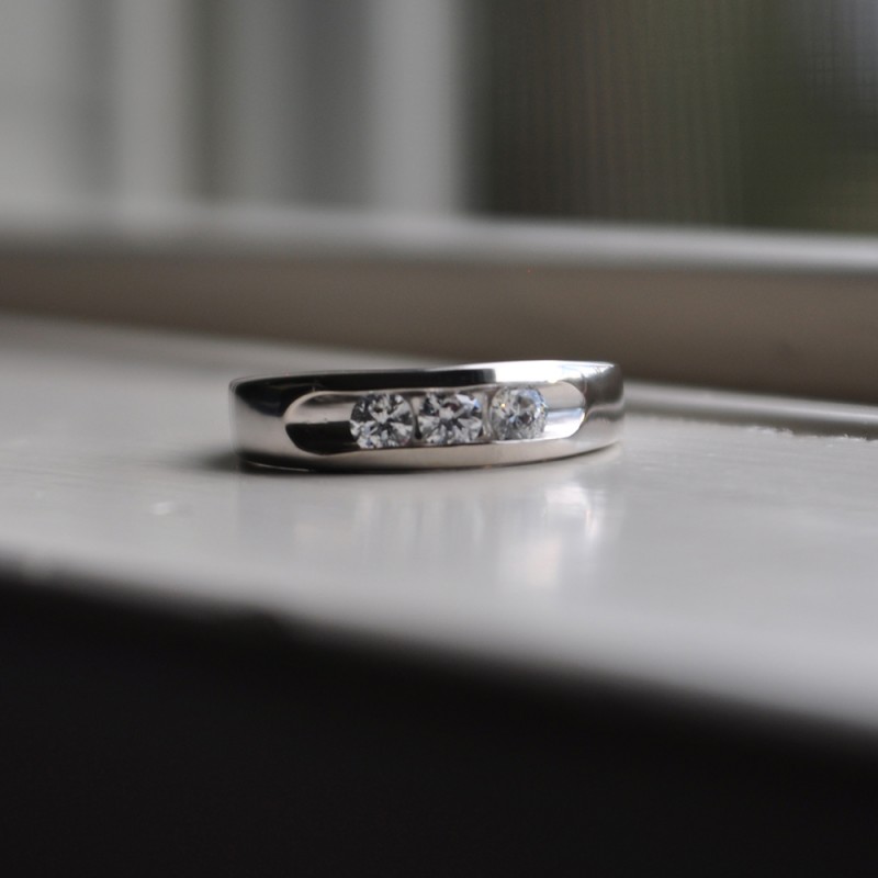 This men's ring features 3 white round channel set stones. The band measures 4.21mm in total width. The total combined carat weight is 0.75 carats. This listing features moissanite, cubic zirconia or natural diamonds. This men's ring weighs 6.47 grams and features a comfort fit band. This men's band is wide and has open ended channels.