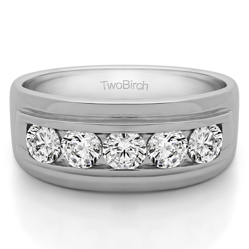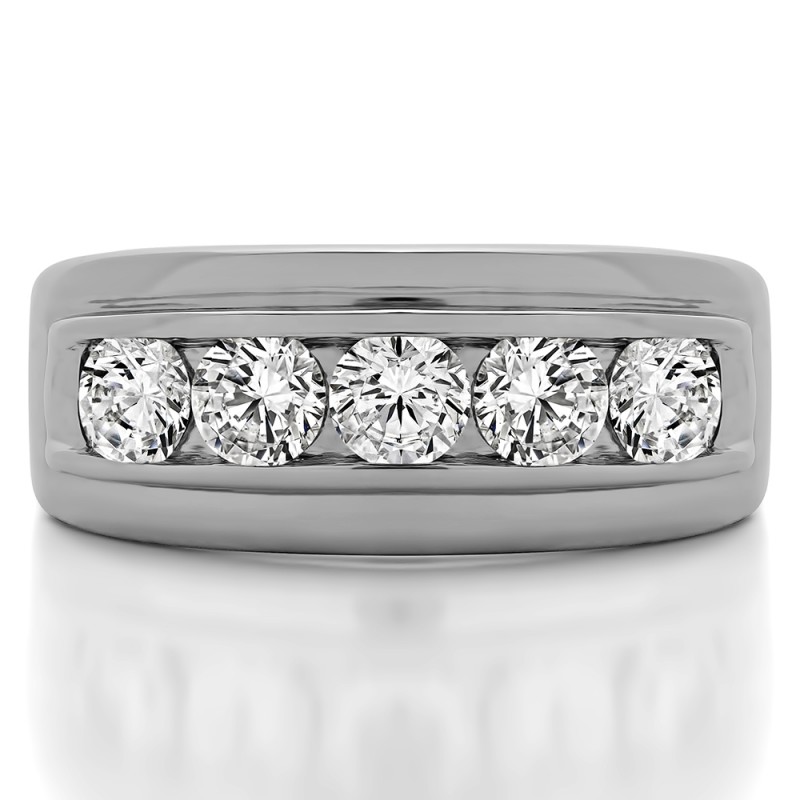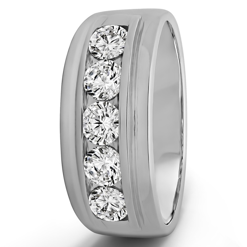 This men's ring features 5 white round channel set stones. The band measures 5.5mm in total width. The total combined carat weight is 2 carats. This listing features moissanite, cubic zirconia or natural diamonds. This men's ring weighs 17.73 grams and features a comfort fit band. This men's ring is wide, with a raised channel in the center.