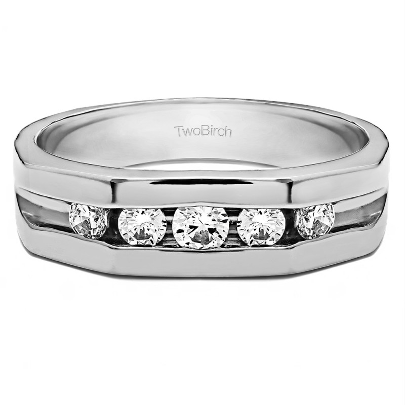 This men's ring features 3, round burnished set birthstones. The band measures 5.5mm in total width. The total combined carat weight is 0.5 carats. This men's ring weighs 22.53 grams and features a comfort fit band. This ring is wide, with a cut out design in the center and edges, and a high polish finish.