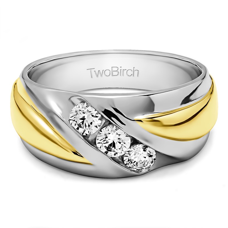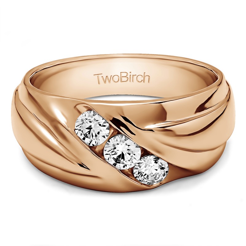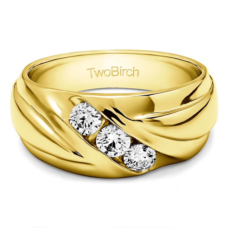 This men's ring features 3, round channel set birthstones. The band measures 5.5mm in total width. The total combined carat weight is 0.48 carats. This men's ring weighs 14.64 grams and features a comfort fit band. This men's ring has an open ended channel with a twisted shank design.