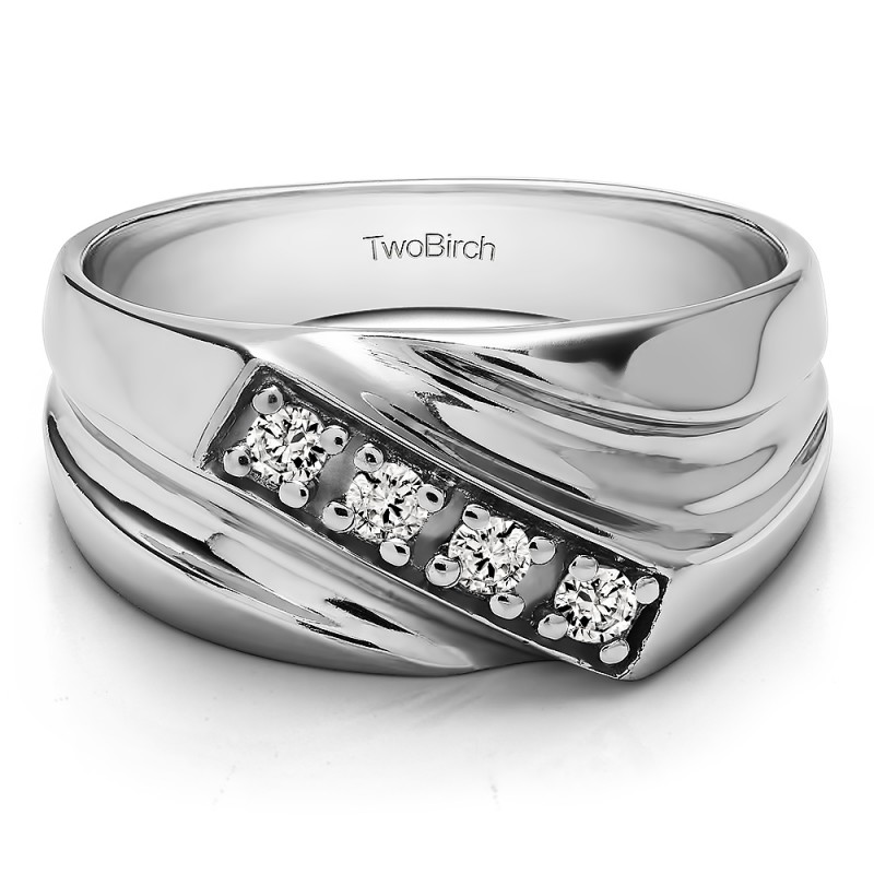 This men's ring features 4, round prong set birthstone stones of your choice. The band measures 5.5mm in total width. The total combined carat weight is 0.24 carats. This men's ring weighs 15.4 grams and features a comfort fit band. This ring has a twirl design, with a stunning high polish finish.