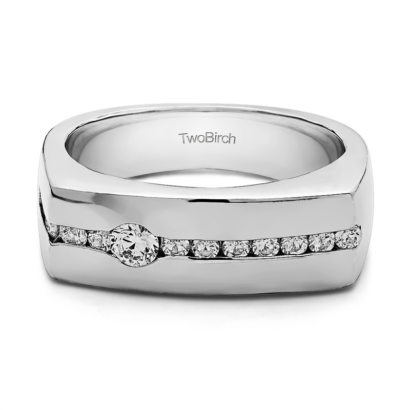 This men's ring features 3, round channel set birthstones. The band measures 5.5mm in total width. The total combined carat weight is 0.5 carats. This men's ring weighs 14.5 grams and features a comfort fit band. This men's ring has a high polish finish with a raised center design.