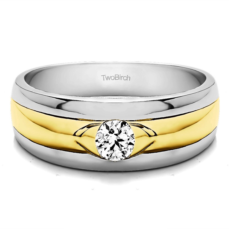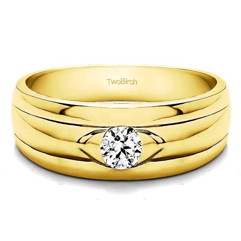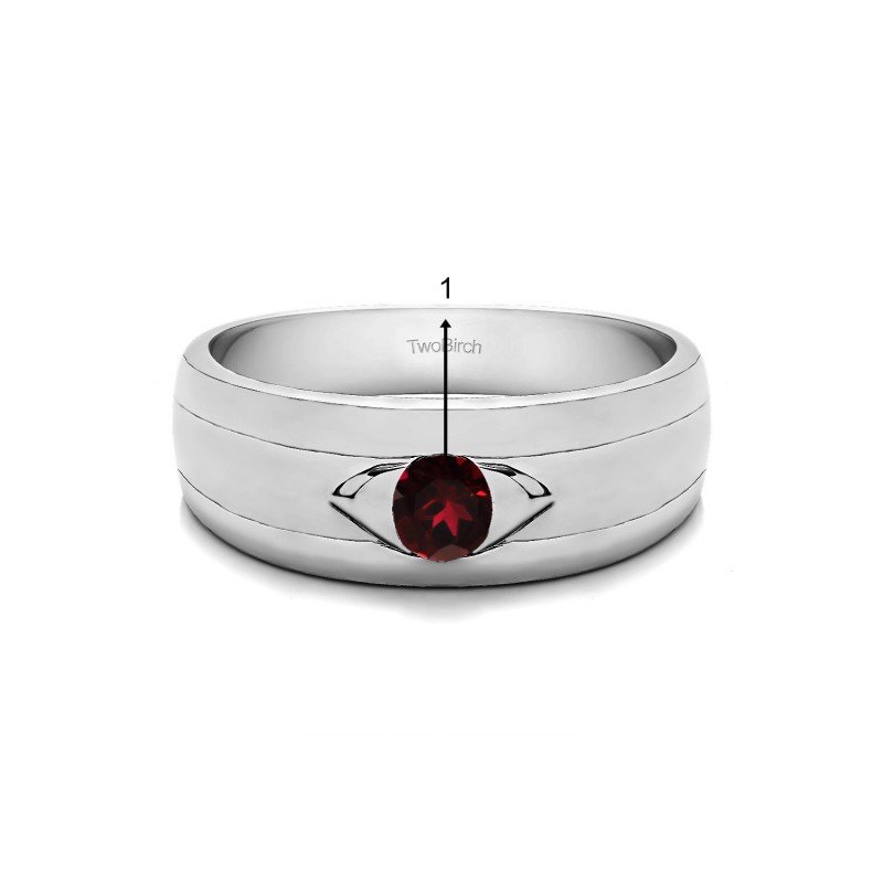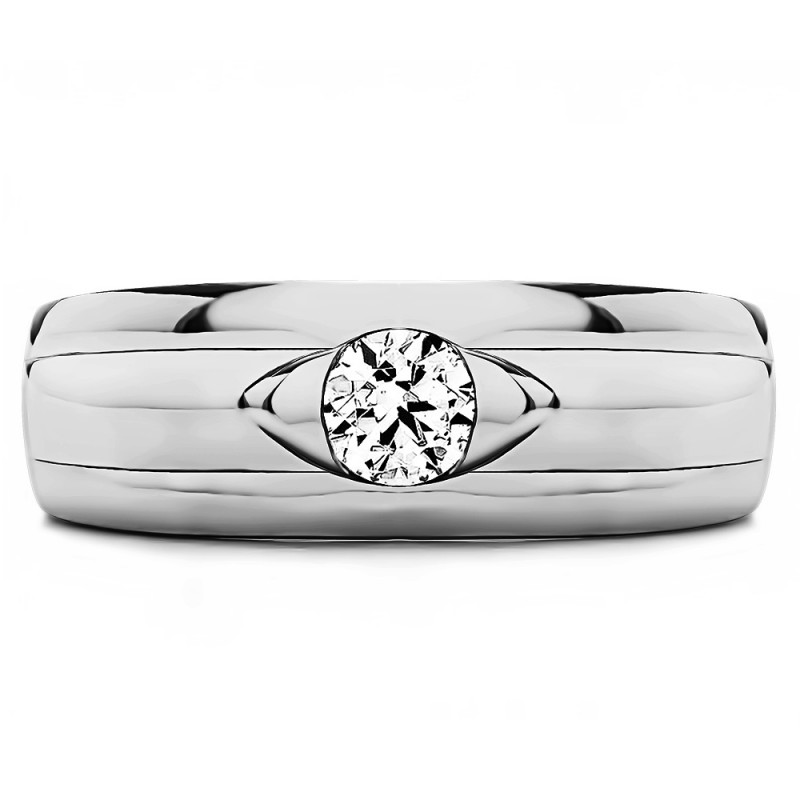 This men's ring features 1, round burnished set birthstone. The band measures 5.5mm in total width. The total combined carat weight is 0.25 carats. This men's ring weighs 15.55 grams and features a comfort fit band. This men's ring has a single stone in the center, with a high polish diamond design in the center, with ribbed shank detailing.