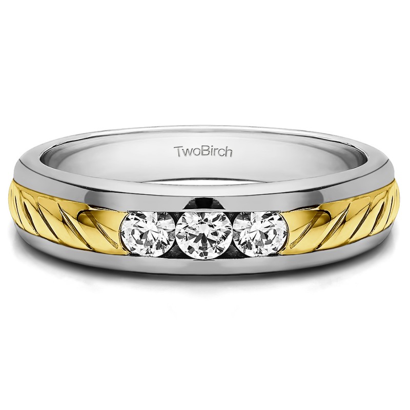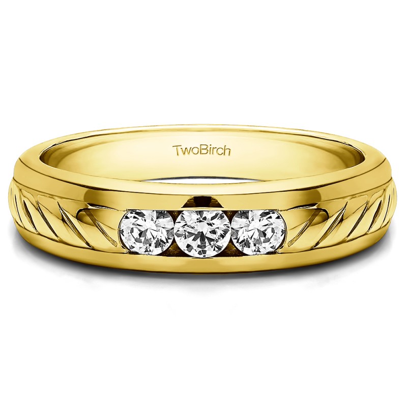 This men's ring features 3, round channel set birthstones. The band measures 5.5mm in total width. The total combined carat weight is 0.5 carats. This men's ring weighs 12.75 grams and features a comfort fit band. This ring features a ribbed design center, and high polish edges.