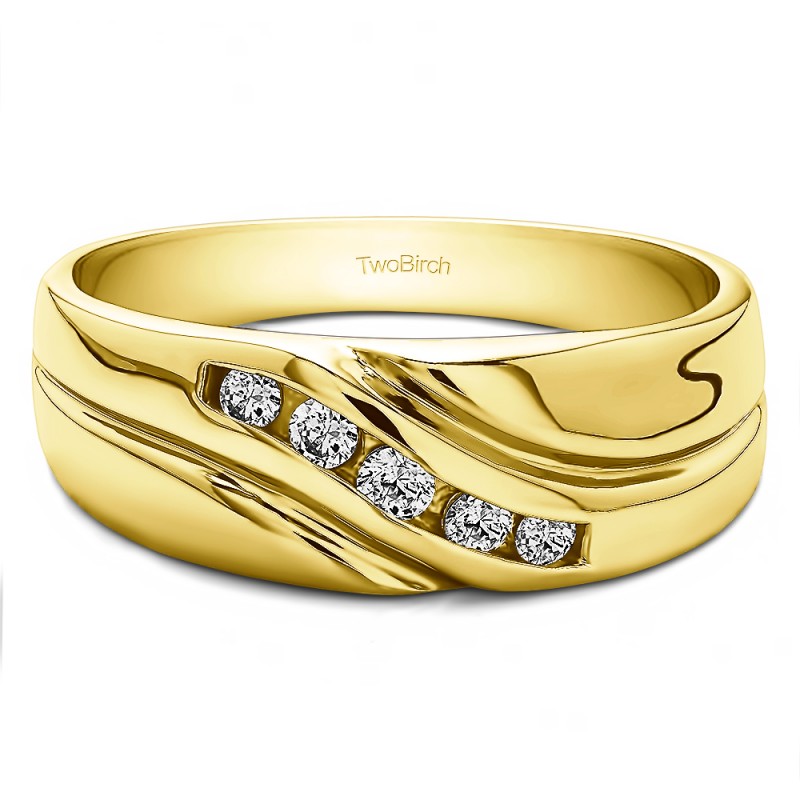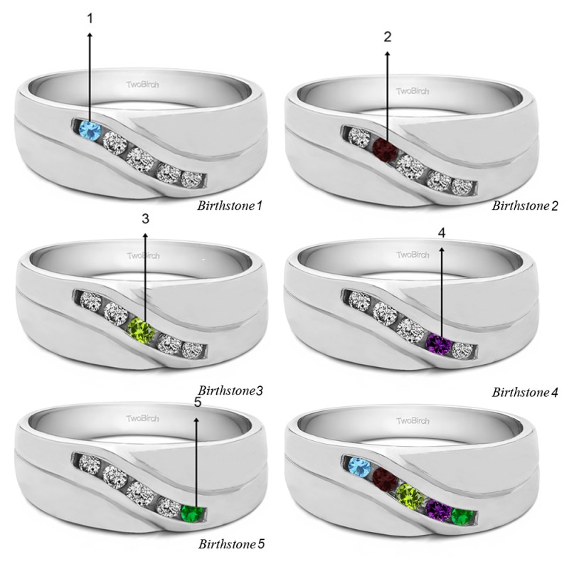 This men's ring features 5, round channel set birthstones of your choice. The band measures 5.5mm in total width. The total combined carat weight is 0.29 carats. This men's ring weighs 12.23 grams and features a comfort fit band. This ring features a twirl design, with a curved channel.
