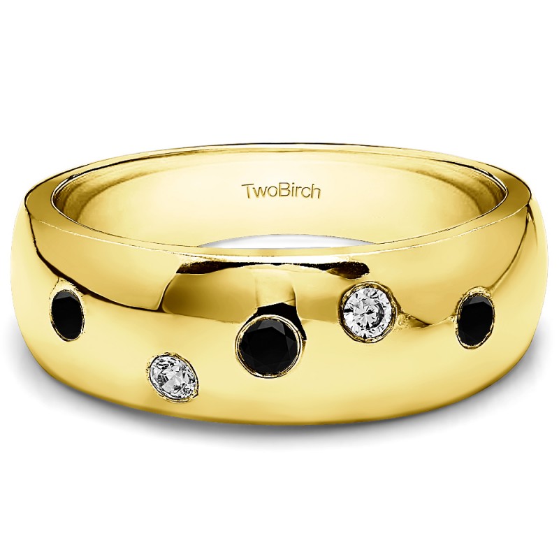 This men's ring features 5, black and white round channel set stones. The band measures 5.5mm in total width. The total combined carat weight is 0.15 carats. This listing features black and white cubic zirconia or black and white diamonds. This men's ring weighs 9.13 grams and features a comfort fit band. This men's ring has a scattered stone design making appear free form.