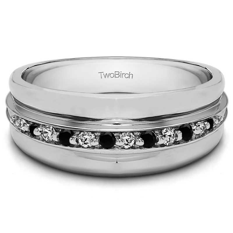 This men's ring features 12, black and white round prong in channel set stones. The band measures 5.5mm in total width. The total combined carat weight is 0.2 carats. This listing features black and white cubic zirconia or black and white diamonds. This men's ring weighs 10.82 grams and features a comfort fit band. This ring features a raised channel, with the stones set with a shared prong in the channel.