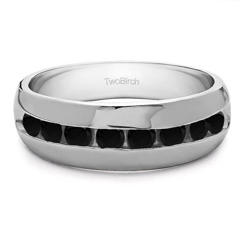 This men's ring features 8, black round channel set stones. The band measures 5.5mm in total width. The total combined carat weight is 0.23 carats. This listing features black cubic zirconia or black diamonds. This men's ring weighs 9.8 grams and features a comfort fit band. This men's wedding band features a stunning high polish finish, with open ended channels.