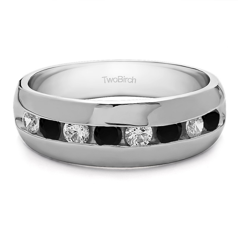 This men's ring features 8, black and white round channel set stones. The band measures 5.5mm in total width. The total combined carat weight is 0.23 carats. This listing features black and white cubic zirconia or black and white diamonds. This men's ring weighs 9.8 grams and features a comfort fit band. This men's wedding band features a stunning high polish finish, with open ended channels.