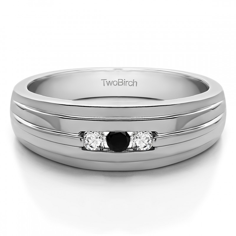 This men's ring features 3, black and white round channel set stones. The band measures 7.5 in total width. The total combined carat weight is 0.24 carats. This listing features black and white cubic zirconia or black and white diamonds. This men's ring weighs 10.85 grams and features a comfort fit band. This men's ring features a ribbed shank. It also has a cut out gallery making it lighter but still sturdy.