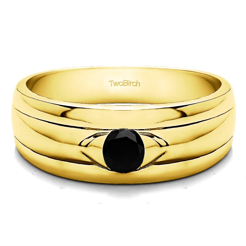 This men's ring features 1, black round burnished set stones. The band measures 5.5mm in total width. The total combined carat weight is 0.25 carats. This listing features black cubic zirconia or black diamonds. This men's ring weighs 15.55 grams and features a comfort fit band. This men's ring has a single stone in the center, with a high polish diamond design in the center, with ribbed shank detailing. The ring features a high polish finish.