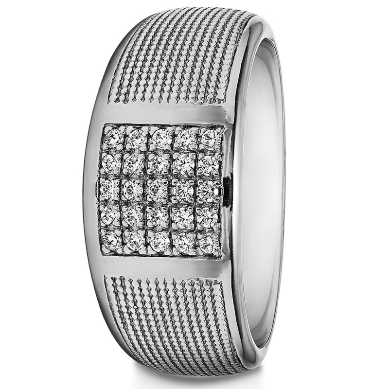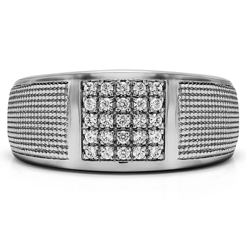 This men's ring features 25, black round pave set stones. The band measures 5.5mm in total width. The total combined carat weight is 0.25 carats. This listing features black cubic zirconia or black diamonds. This men's ring weighs 19.05 grams and features a comfort fit band. This men's ring is wide with a designer shank and square center cluster of stones.
