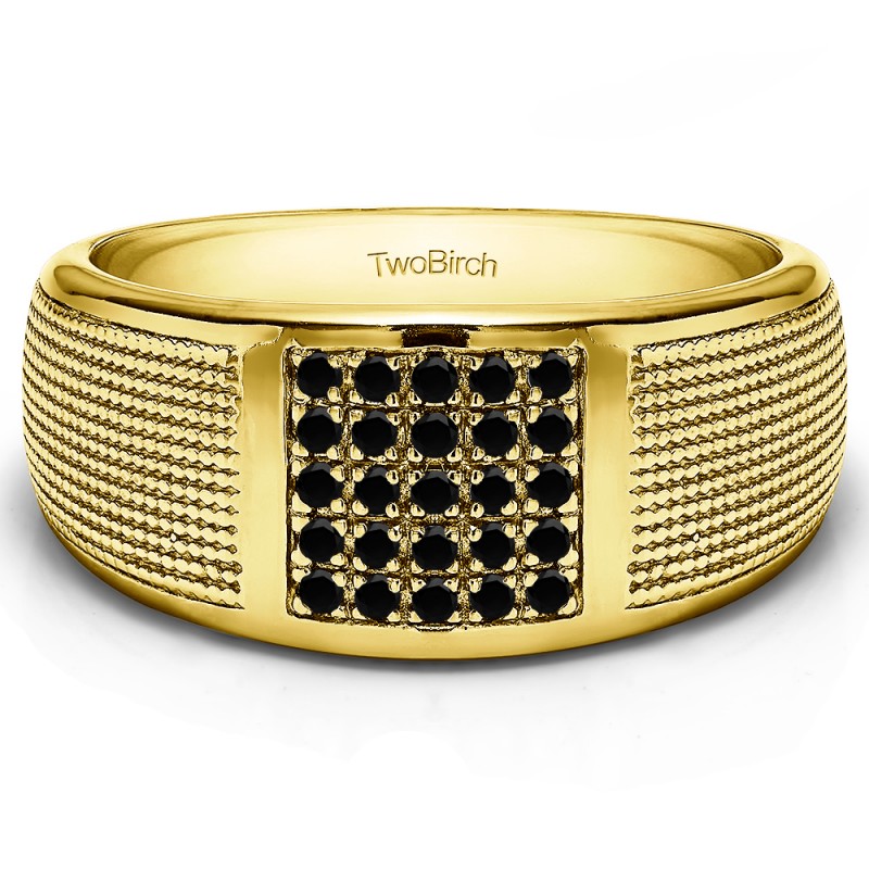 This men's ring features 25, black round pave set stones. The band measures 5.5mm in total width. The total combined carat weight is 0.25 carats. This listing features black cubic zirconia or black diamonds. This men's ring weighs 19.05 grams and features a comfort fit band. This men's ring is wide with a designer shank and square center cluster of stones.