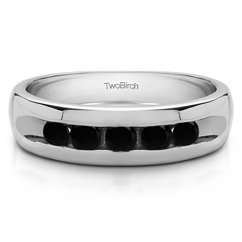 This men's ring features 5, black round channel set stones. The band measures 5.5mm in total width. The total combined carat weight is 0.25 carats. This listing features black cubic zirconia or black diamonds. This men's ring weighs 8.16 grams and features a comfort fit band. This men's band features a wide channel, with open ends, and gorgeous high polish finish.