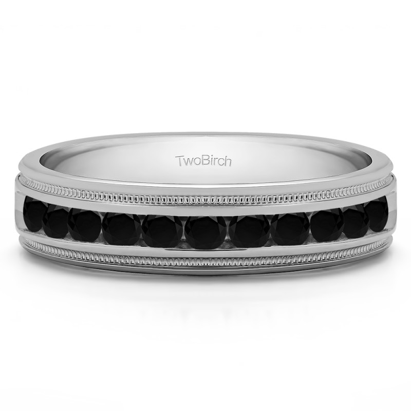 This men's ring features 11, black round channel set stones. The band measures 5.5mm in total width. The total combined carat weight is 0.27 carats. This listing features black cubic zirconia or black diamonds. This men's ring weighs 5.99 grams and features a comfort fit band. This men's ring features a traditional channel with millgrained edges.