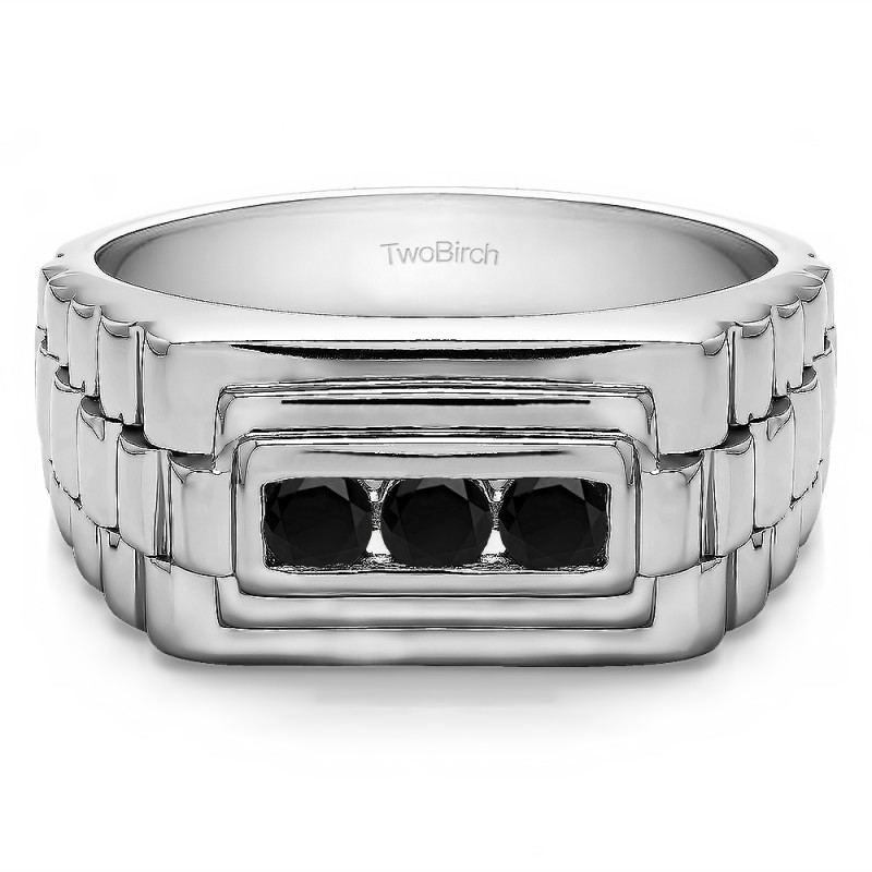 This men's ring features 3, black round channel set stones. The band measures 5.5mm in total width. The total combined carat weight is 0.3 carats. This listing features black cubic zirconia or black diamonds. This men's ring weighs 10.03 grams and features a comfort fit band. This men's ring features a jubilee style shank.