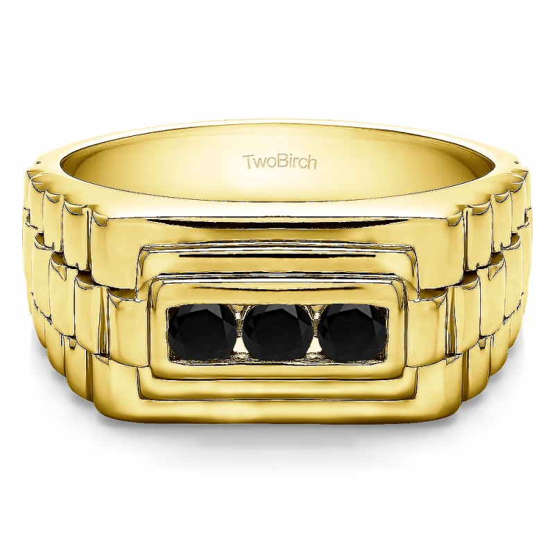 This men's ring features 3, black round channel set stones. The band measures 5.5mm in total width. The total combined carat weight is 0.3 carats. This listing features black cubic zirconia or black diamonds. This men's ring weighs 10.03 grams and features a comfort fit band. This men's ring features a jubilee style shank.