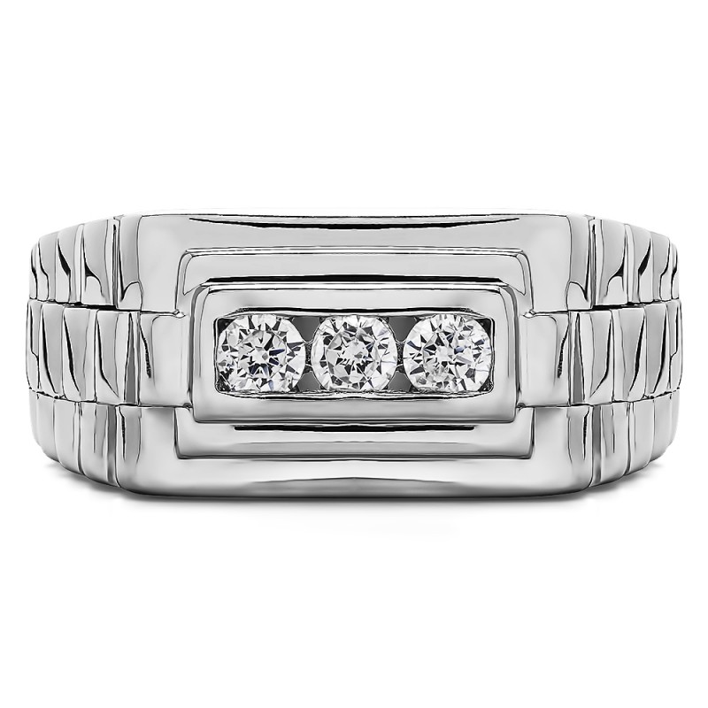 This men's ring features 3, black and white round channel set stones. The band measures 5.5mm in total width. The total combined carat weight is 0.3 carats. This listing features black and white cubic zirconia or black and white diamonds. This men's ring weighs 10.03 grams and features a comfort fit band. This men's ring features a jubilee style shank.