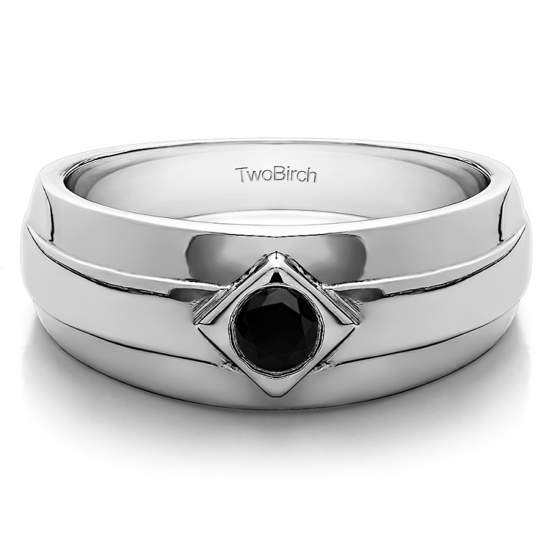 This men's ring features 1, black round bezel set stones. The band measures 5.5mm in total width. The total combined carat weight is 0.3 carats. This listing features black cubic zirconia or black diamonds. This men's ring weighs 14.61 grams and features a comfort fit band. This men's ring has one burnished stone, with a high polish diamond shaped design around the stone.