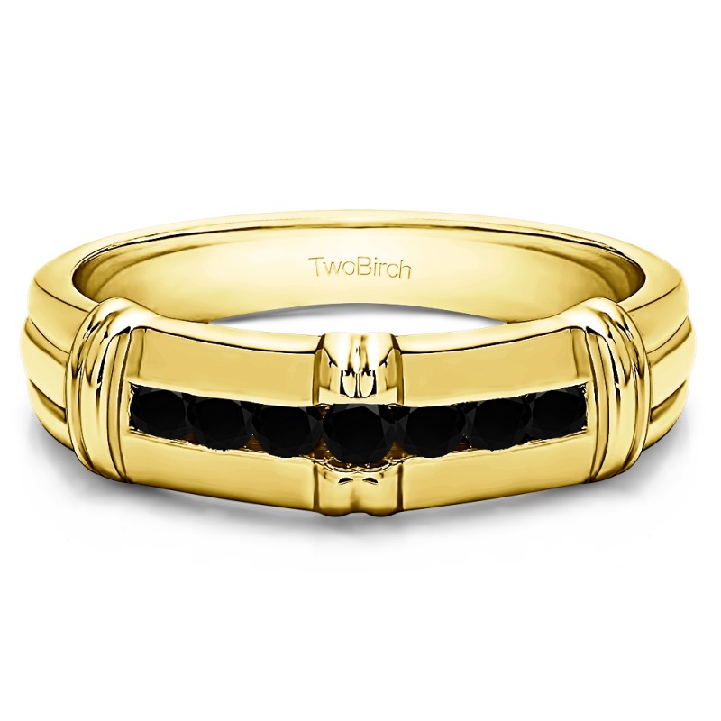 This men's ring features 7, black round channel set stones. The band measures 5.5mm in total width. The total combined carat weight is 0.31 carats. This listing features black cubic zirconia or black diamonds. This men's ring weighs 9.92 grams and features a comfort fit band. This men's ring features a ribbed design on the middle and ends of the channel.