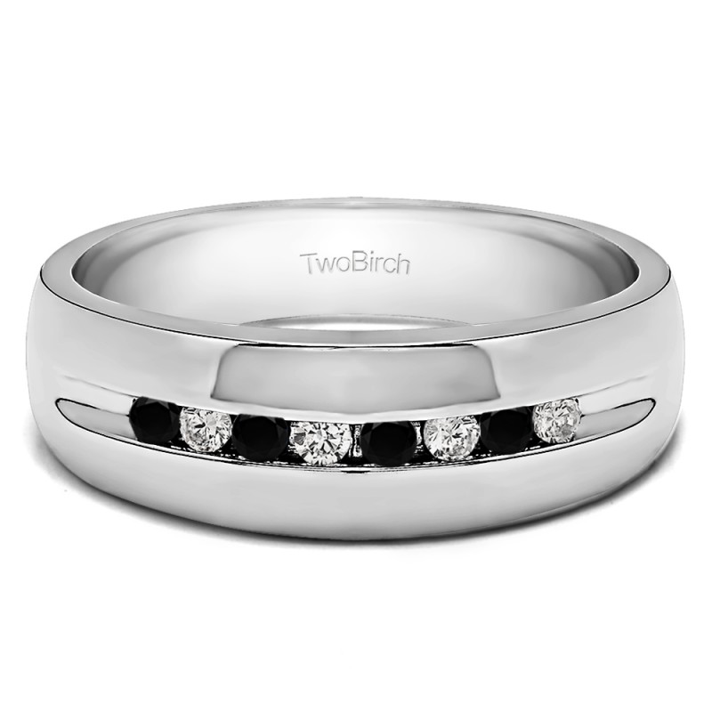 This men's ring features 8, black and white round channel set stones. The band measures 5.5mm in total width. The total combined carat weight is 0.32 carats. This listing features black and white cubic zirconia or black and white diamonds. This men's ring weighs 12.73 grams and features a comfort fit band. This ring features a thing channel, with open ends, and a stunning high polish finish.