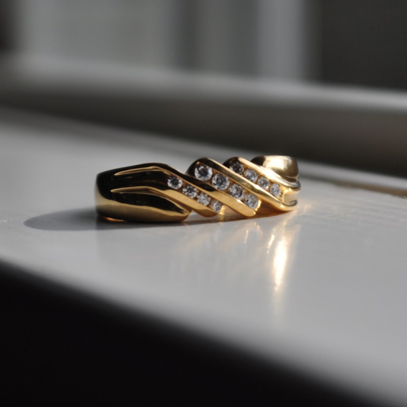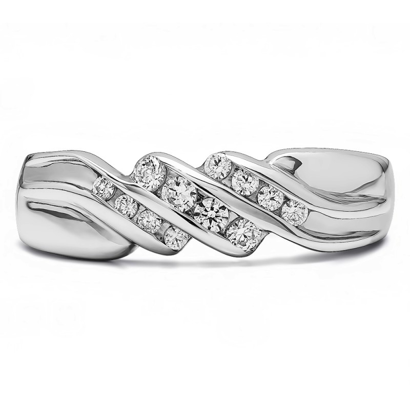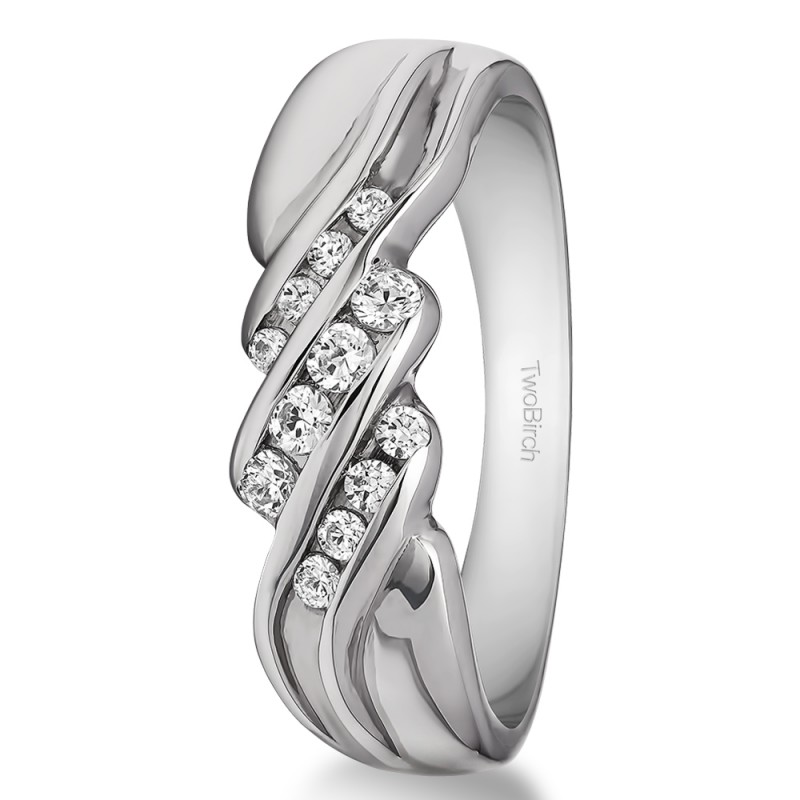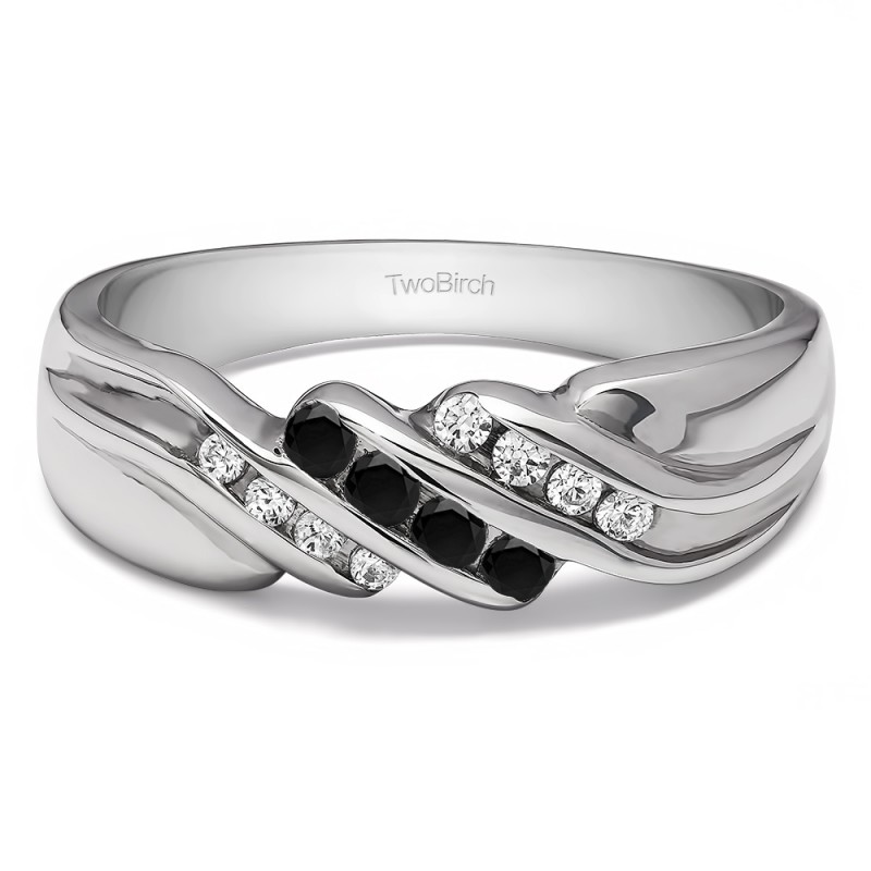 This men's ring features 12, black and white round channel set stones. The band measures 5.5mm in total width. The total combined carat weight is 0.32 carats. This listing features black and white cubic zirconia or black and white diamonds. This men's ring weighs 15.5 grams and features a comfort fit band. This men's ring has three channels with a twisted shank design.