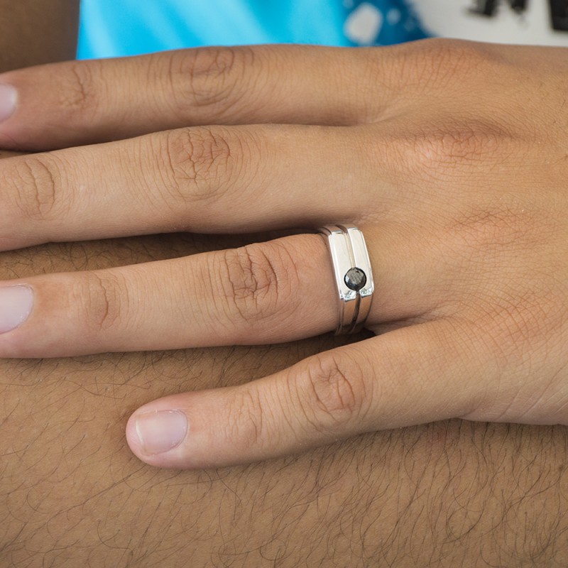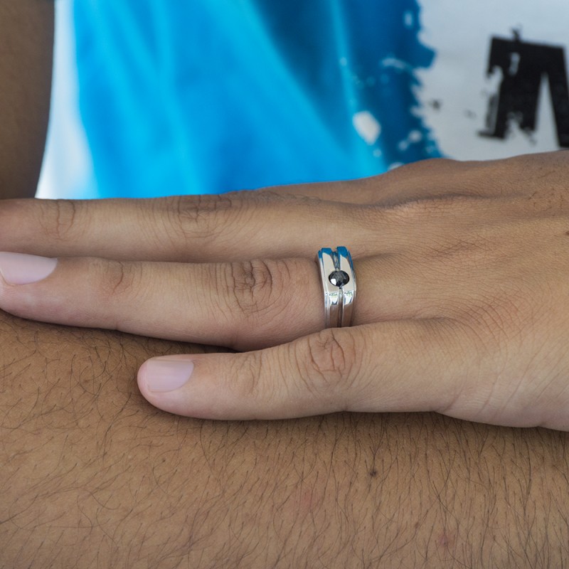 This men's ring features 1, black round burnished set stone. The band measures 5.5mm in total width. The total carat weight is 0.33 carats. This listing features black cubic zirconia or black diamonds. This men's ring weighs 11.43 grams and features a comfort fit band. This men's ring features an indented center in the shank.