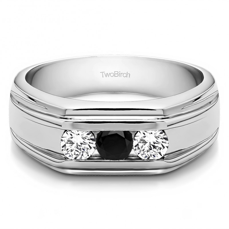 This men's ring features 3, black and white round channel set stones. The band measures 5.5mm in total width. The total combined carat weight is 0.33 carats. This listing features black and white cubic zirconia or black and white diamonds. This men's ring weighs 14.61 grams and features a comfort fit band. This men's ring features an open ended channel, with raised edges and a high polish finish.