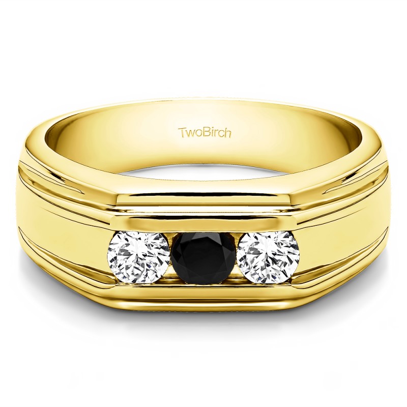 This men's ring features 3, black and white round channel set stones. The band measures 5.5mm in total width. The total combined carat weight is 0.33 carats. This listing features black and white cubic zirconia or black and white diamonds. This men's ring weighs 14.61 grams and features a comfort fit band. This men's ring features an open ended channel, with raised edges and a high polish finish.
