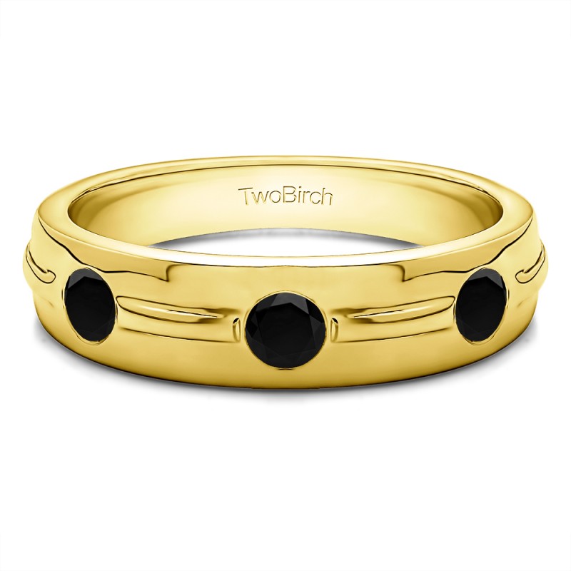 This men's ring features 3, black round burnished set stones. The band measures 5.5mm in total width. The total combined carat weight is 0.35 carats. This listing features black cubic zirconia or black diamonds. This men's ring weighs 11.26 grams and features a comfort fit band. This men's band features a raised center between the stones with a polished finish.