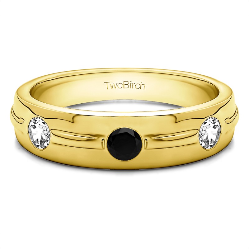 This men's ring features 3, black and white round burnished set stones. The band measures 5.5mm in total width. The total combined carat weight is 0.35 carats. This listing features black and white cubic zirconia or black and white diamonds. This men's ring weighs 11.26 grams and features a comfort fit band. This men's band features a raised center between the stones with a polished finish.