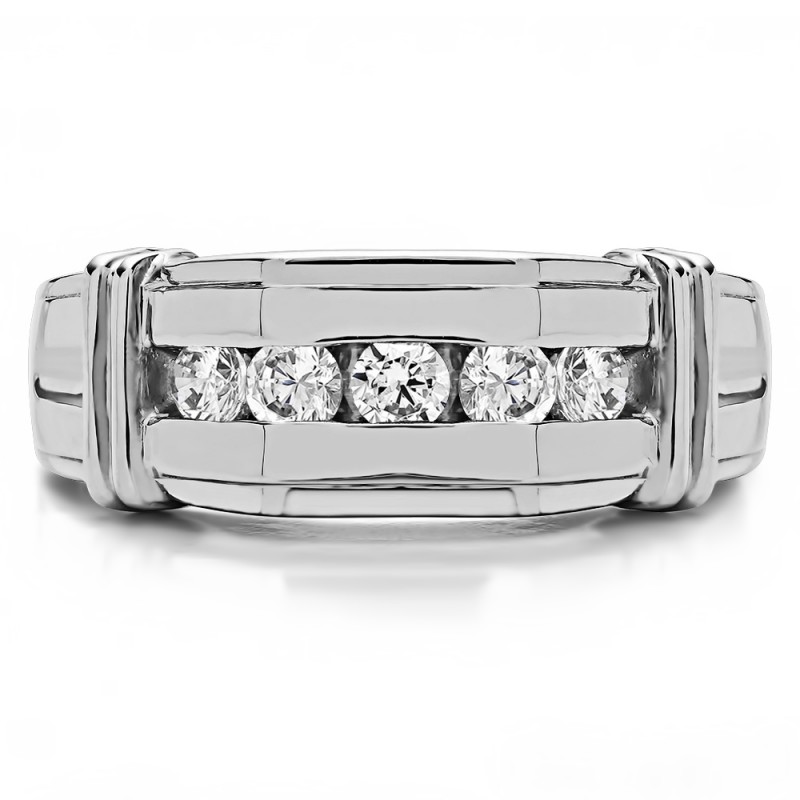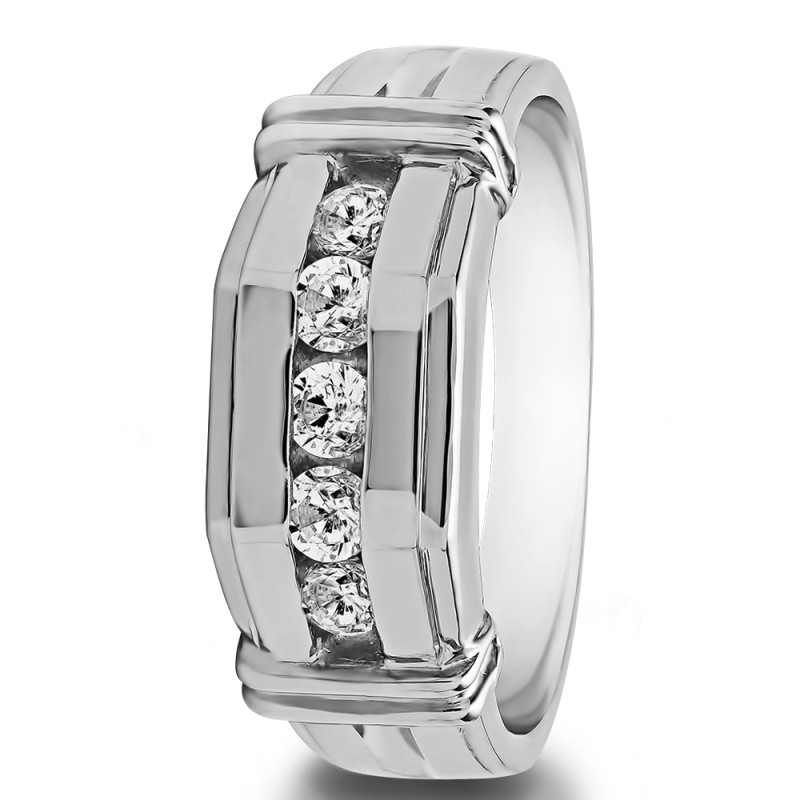This men's ring features 5, black and white round channel set stones. The band measures 5.5mm in total width. The total combined carat weight is 0.36 carats. This listing features black and white cubic zirconia or black and white diamonds. This men's ring weighs 12.79 grams and features a comfort fit band. This men's band features a raised design on each of the channel with a flat top center.