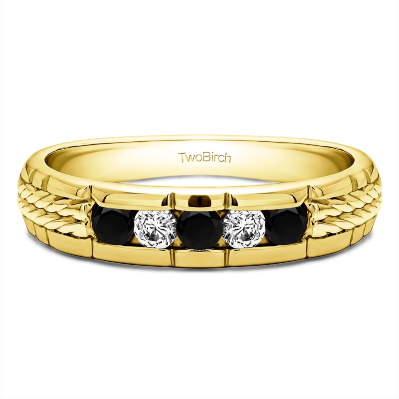 This men's ring features 3, black and white round channel set stones. The band measures 5.5mm in total width. The total combined carat weight is 0.36 carats. This listing features black and white cubic zirconia or black and white diamonds. This men's ring weighs 14.67 grams and features a comfort fit band. This ring has a braided center with high polished edges.