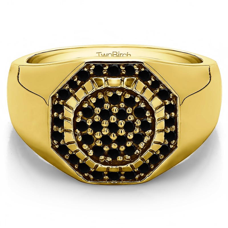 This men's ring features 43, black round channel set stones. The band measures 5.5mm in total width. The total combined carat weight is 0.48 carats. This listing features black cubic zirconia or black diamonds. This men's ring weighs 17.67 grams and features a comfort fit band. This men's ring has an engraved with a cluster of prong set stones in the center.