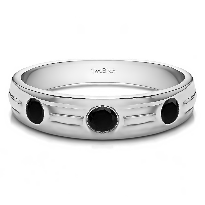 This men's ring features 3, black round channel set stones. The band measures 5.5mm in total width. The total combined carat weight is 0.48 carats. This listing features black cubic zirconia or black diamonds. This men's ring weighs 12.81 grams and features a comfort fit band. This men's band features a raised center between the stones with a polished finish.