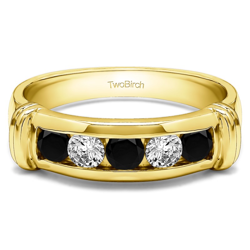 This men's ring features 5, black and white round channel set stones. The band measures 5.5mm in total width. The total combined carat weight is 0.49 carats. This listing features black and white cubic zirconia or black and white diamonds. This men's ring weighs 11.41 grams and features a comfort fit band. This men's ring features a raised ribbed shank design.