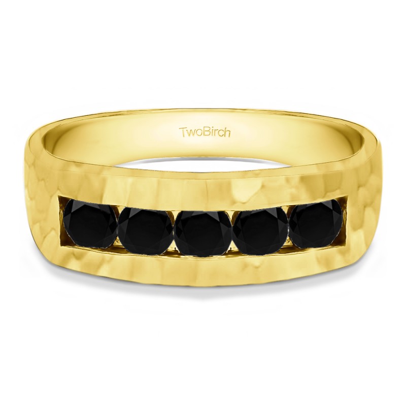 This men's ring features 5, black round channel set stones. The band measures 5.5mm in total width. The total combined carat weight is 0.5 carats. This listing features black cubic zirconia or black diamonds. This men's ring weighs 13.01 grams and features a comfort fit band. This men's ring features a flat top and a hammered finish.