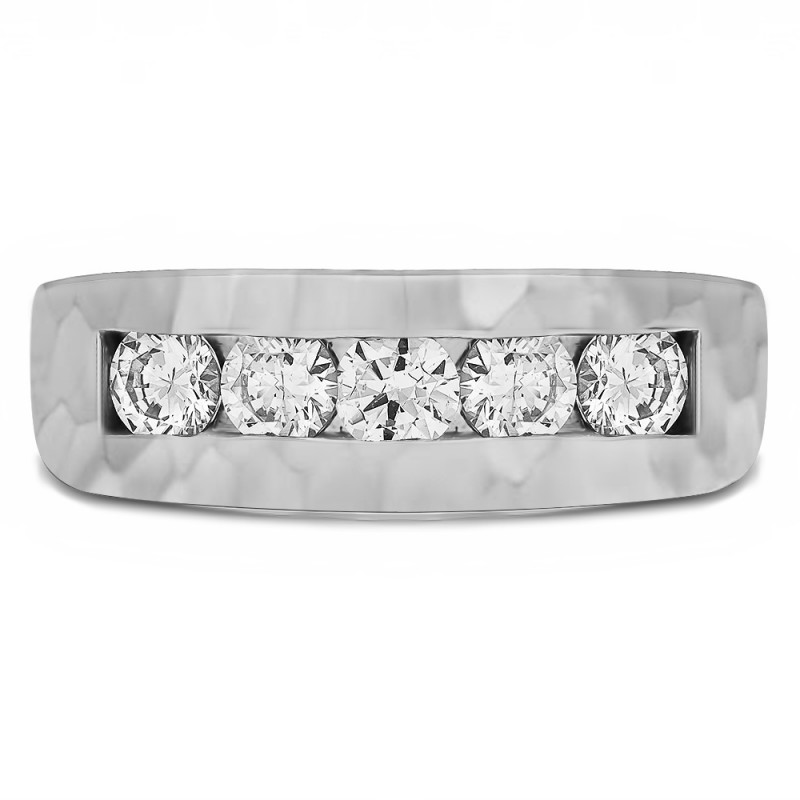 This men's ring features 5, black and white round channel set stones. The band measures 5.5mm in total width. The total combined carat weight is 0.5 carats. This listing features black and white cubic zirconia or black and white diamonds. This men's ring weighs 13.01 grams and features a comfort fit band. This men's ring features a flat top and a hammered finish.