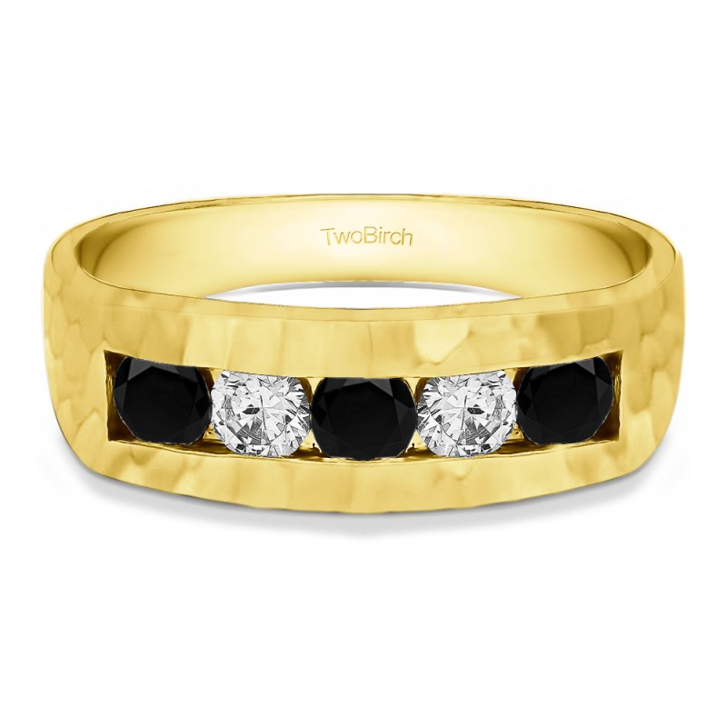 This men's ring features 5, black and white round channel set stones. The band measures 5.5mm in total width. The total combined carat weight is 0.5 carats. This listing features black and white cubic zirconia or black and white diamonds. This men's ring weighs 13.01 grams and features a comfort fit band. This men's ring features a flat top and a hammered finish.