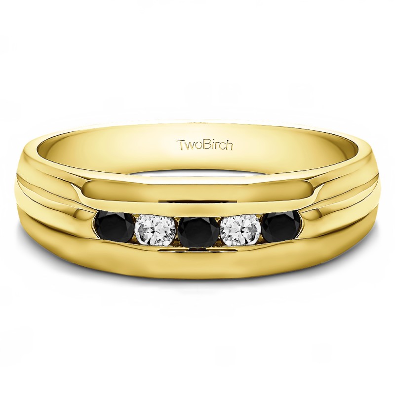 This men's ring features 5, black and white round channel set stones. The band measures 5.5mm in total width. The total combined carat weight is 0.5 carats. This listing features black and white cubic zirconia or black and white diamonds. This men's ring weighs 14.67 grams and features a comfort fit band. This ring has a raised center with flat high polished edges.
