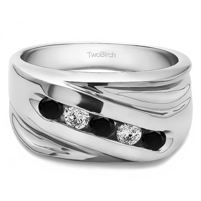 This men's ring features 5, black and white round channel set stones. The band measures 5.5mm in total width. The total combined carat weight is 0.5 carats. This listing features black and white cubic zirconia or black and white diamonds. This men's ring weighs 18.28 grams and features a comfort fit band. This men's wedding ring has a straight channel, with a ribbed shank design and a high polish finish.