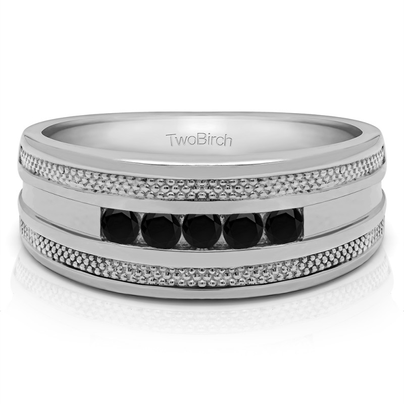 This men's ring features 5, black round channel set stones. The band measures 5.5mm in total width. The total combined carat weight is 0.5 carats. This listing features black cubic zirconia or black diamonds. This men's ring weighs 17.46 grams and features a comfort fit band. This men's ring is wide, with millgraining on both sides of the shank, and a polished center.