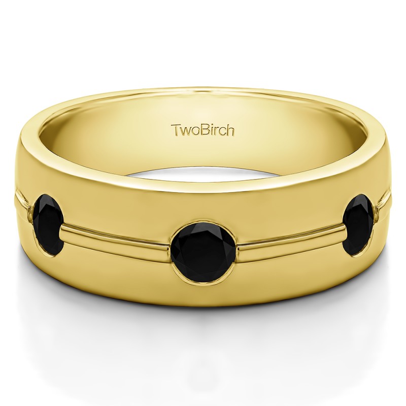 This men's ring features 3, black round burnished set stones. The band measures 5.5mm in total width. The total combined carat weight is 0.5 carats. This listing features black cubic zirconia or black diamonds. This men's ring weighs 14.68 grams and features a comfort fit band. This men's ring has a low cut out line in the center between the stones and features a polished finish.