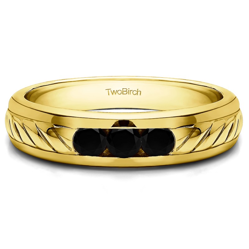 This men's ring features 3, black round channel set stones. The band measures 5.5mm in total width. The total combined carat weight is 0.5 carats. This listing features black cubic zirconia or black diamonds. This men's ring weighs 12.75 grams and features a comfort fit band. This ring features a ribbed design center, and high polish edges.