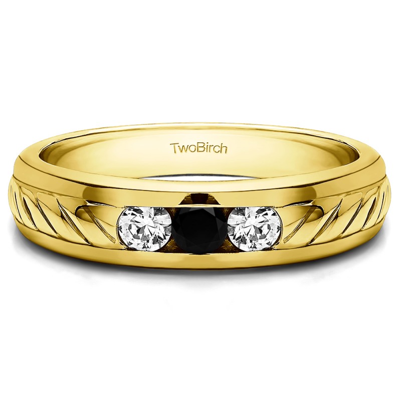 This men's ring features 3, black and white round channel set stones. The band measures 5.5mm in total width. The total combined carat weight is 0.5 carats. This listing features black and white cubic zirconia or black and white diamonds. This men's ring weighs 12.75 grams and features a comfort fit band. This ring features a ribbed design center, and high polish edges.