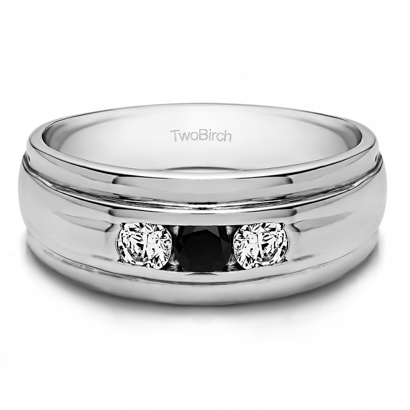 This men's ring features 3, black and white round channel set stones. The band measures 5.5mm in total width. The total combined carat weight is 0.5 carats. This listing features black and white cubic zirconia or black and white diamonds. This men's ring weighs 14.5 grams and features a comfort fit band. This men's ring has a high polish finish with a raised center design.