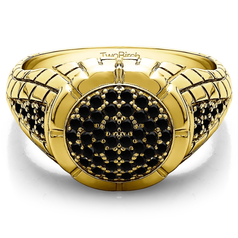 This men's ring features 54, black round prong set stones. The band measures 5.5mm in total width. The total combined carat weight is 0.54 carats. This listing features black cubic zirconia or black diamonds. This men's ring weighs 8.47 grams and features a comfort fit band. This men's ring has a domed shape with a flat top. The top of the ring has prong set round stones with ribbed details on the shank.