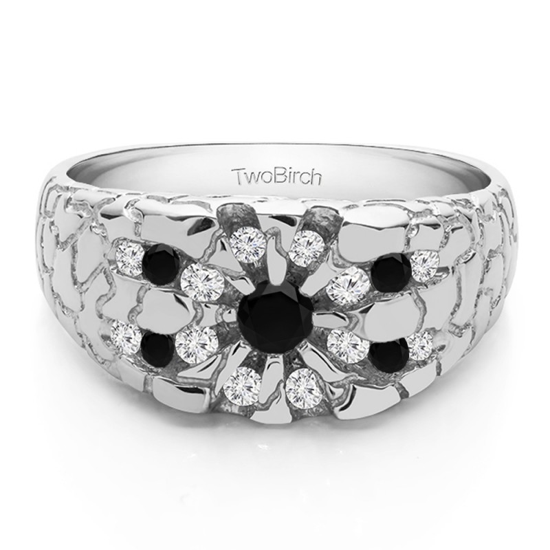 This men's ring features 17, black and white round channel set stones. The band measures 7 in total width. The total combined carat weight is 0.71 carats. This listing features black and white cubic zirconia or black and white diamonds. This men's ring weighs 11.01 grams and features a comfort fit band. This men's ring features an engraved design with a high polish finish. It also has a cut out gallery making it lighter but still sturdy.