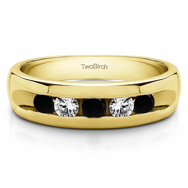 This men's ring features 5, black and white round channel set stones. The band measures 5.5mm in total width. The total combined carat weight is 0.75 carats. This listing features black and white cubic zirconia or black and white diamonds. This men's ring weighs 11.16 grams and features a comfort fit band. This men's band features a wide channel, with open ends, and gorgeous high polish finish.